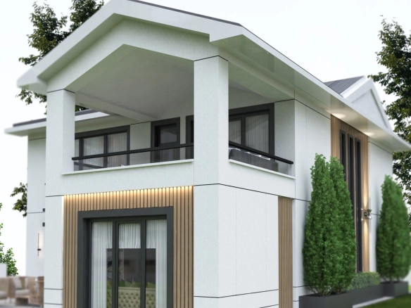 PROTAS hafif çelik evlerde, müşterimiz dilerse ahşap görünümlü çimento esaslı levhalarla dış cephede kaplama yapılmaktadır. Bu sayede yapı hem ahşap ev görünümüne kavuşmakta hem de yangın, böceklenme, yapısal bozulma gibi tehlikeler ortadan kalkmaktadır.