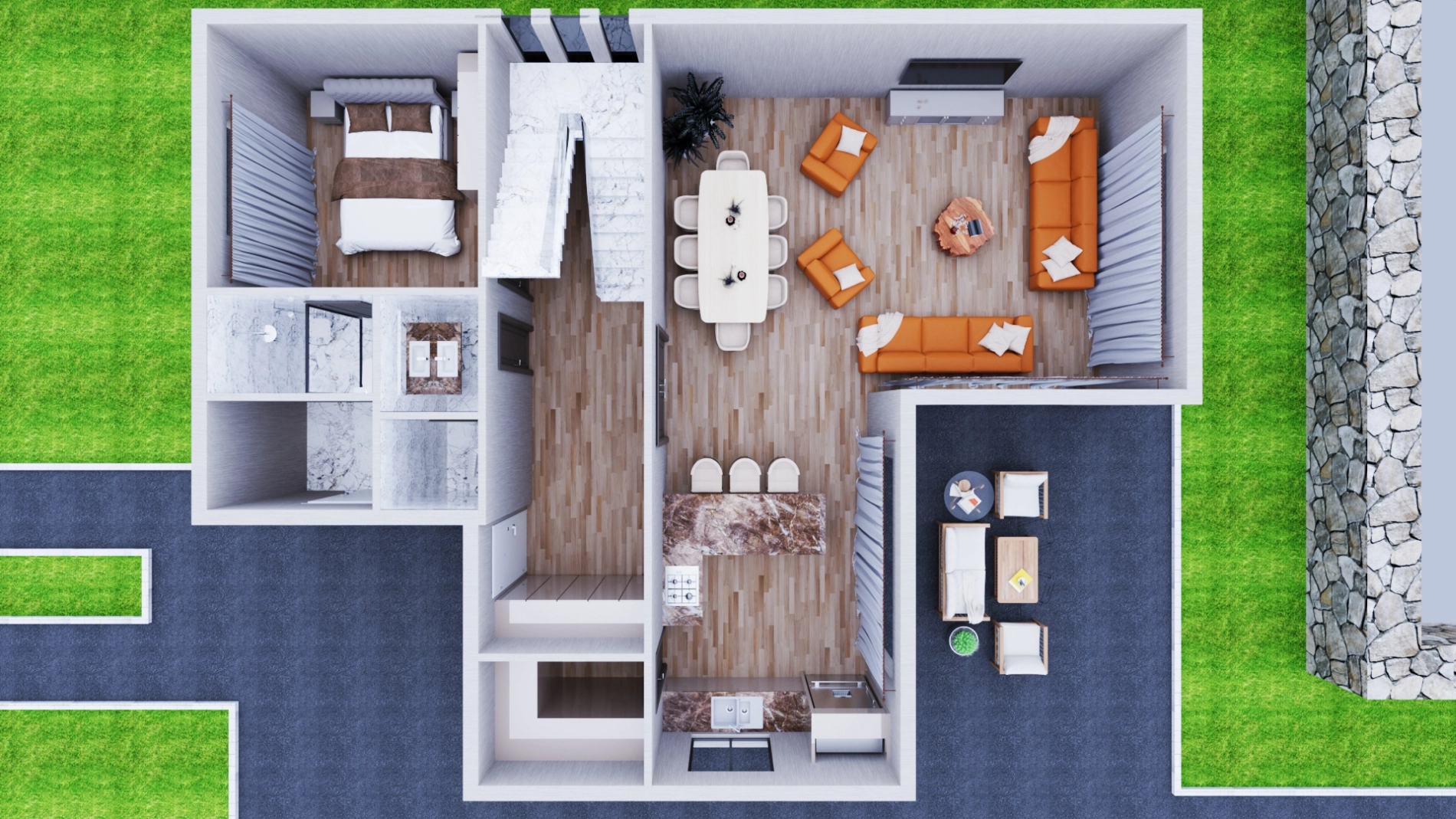 PROTAS hafif çelik evlerde, müşterimiz dilerse doğal taş görünümlü çimento esaslı levhalarla dış cephede kaplama yapılmaktadır. Bu sayede yapı hem taş ev görünümüne kavuşmakta hem de deprem tehlikesi ortadan kalkmaktadır.